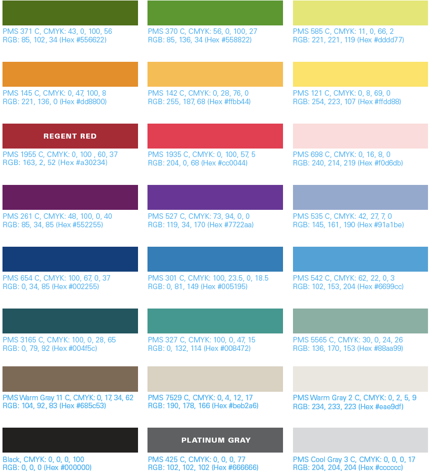 A color palette is provided for use in both internal and external applications. These colors may be used singly or in combination.